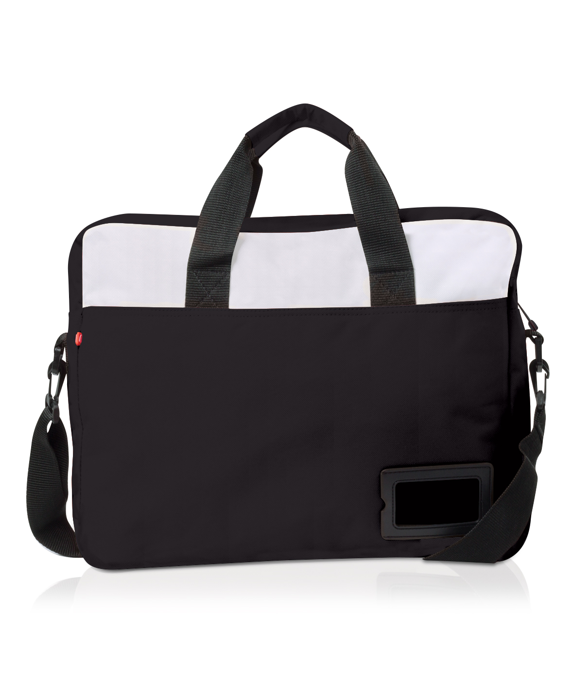 Zippered main compartment with double zip pullers.Double carry handle with wrap.Adjustable and detachable shoulder strap with shoulder pad.Front zippered pocket with organiser panelBusiness card holder on back.