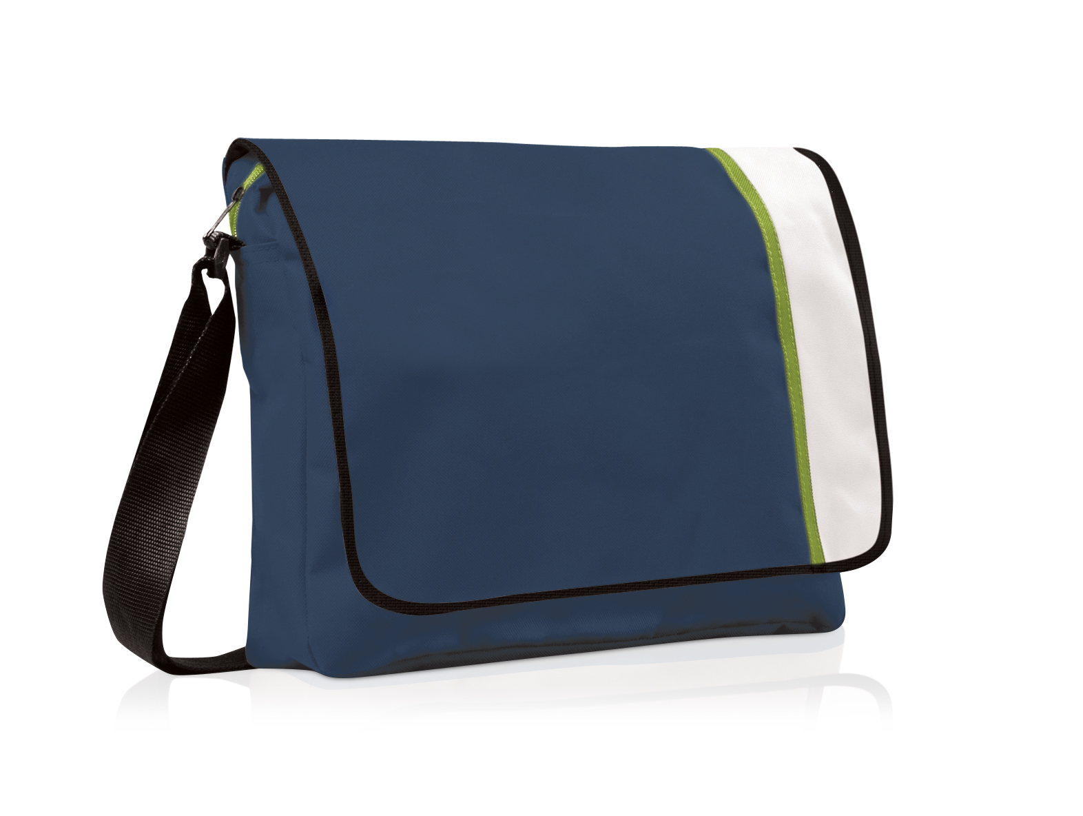 Zippered main compartment.Front flap with Velcro closure.Adjustable shoulder strapBusiness card holder on back.