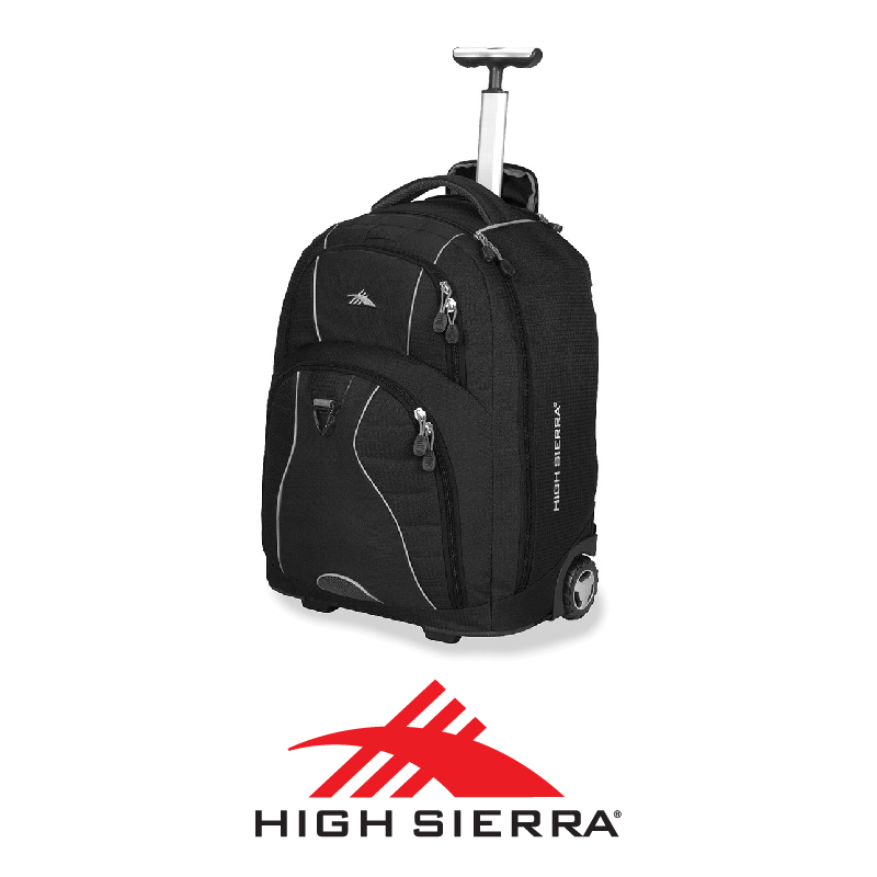 Main features of the High Sierra Freewheel 17" Laptop Wheel Backpack include:Large, zippered front compartment has deluxe organizer with media pocket, multiple open pockets and key fob.Zippered accessory compartment has a headphone port.Smooth rolling, corner-mounted wheels. Single-tube telescoping handle stows inside a protective zippered compartment.Contoured, adjustable Vapel mesh padded shoulder straps tuck away inside the padded back panel.Open side pocket holds a water bottle or other gear.Triangle clip to attach a lock or other accessories.Corner guards and rub rails protect the bag from abrasion.Comfortable Vapel mesh padded grab handle.Reflective accents for night safety.